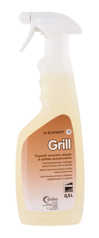 K-Expert 9 Grill on tugevalt aluseline ahjude ja grillide puhastusaine. Kasutatakse suurköökides grillide ja ahjude roostevabast terasest pindade puhastamiseks. Sobib kasutamiseks ka toiduaineid käitlevates ettevõtetes. K-Expert 9 Grill on tugevalt aluseline puhastusvahend. Bioloogiliselt lagunevad pindaktiivsed ained kompleksis leelisega eemaldavad efektiivselt nõe, rasva, kõrbenud mustuse ja söestunud küpsetusjäägid. Head niisutavad omadused kiirendavad mustuse eemaldumist. Tähelepanu!! Ei sobi alumiiniumist, kergmetallist, värvitud, email jm alust mittetaluvatel materjalidel kasutamiseks. Ei sobi kasutamiseks isepuhastuvates grillahjudes. Võimalike ärritusnähtude vältimiseks olla pihustamisel ettevaatlik.